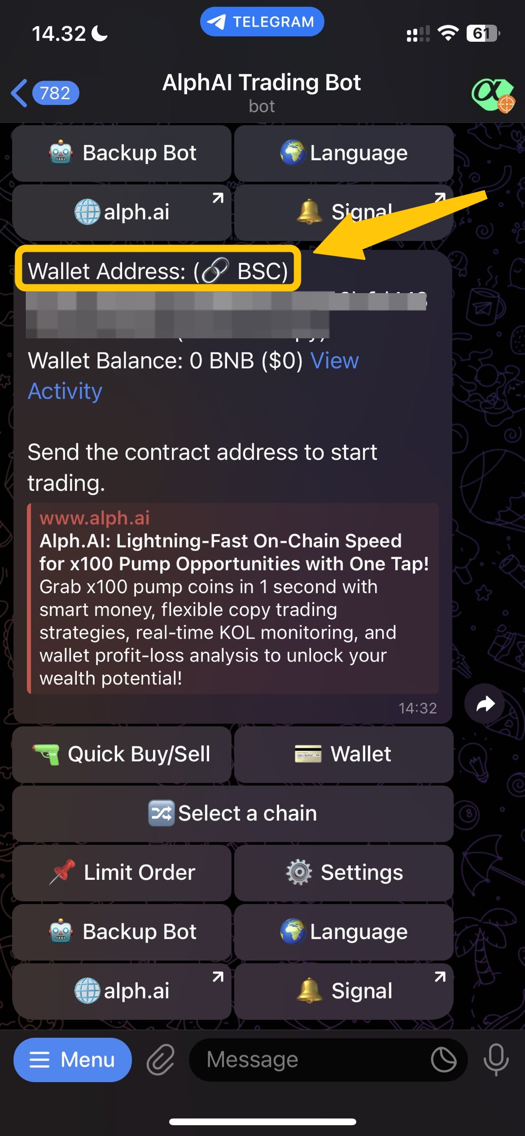 Anda dapat melihat BSC Wallet Address Anda di bawah tanda panah dan siap untuk menyalin jumlah DEPOSIT BSC dari sumber lain.