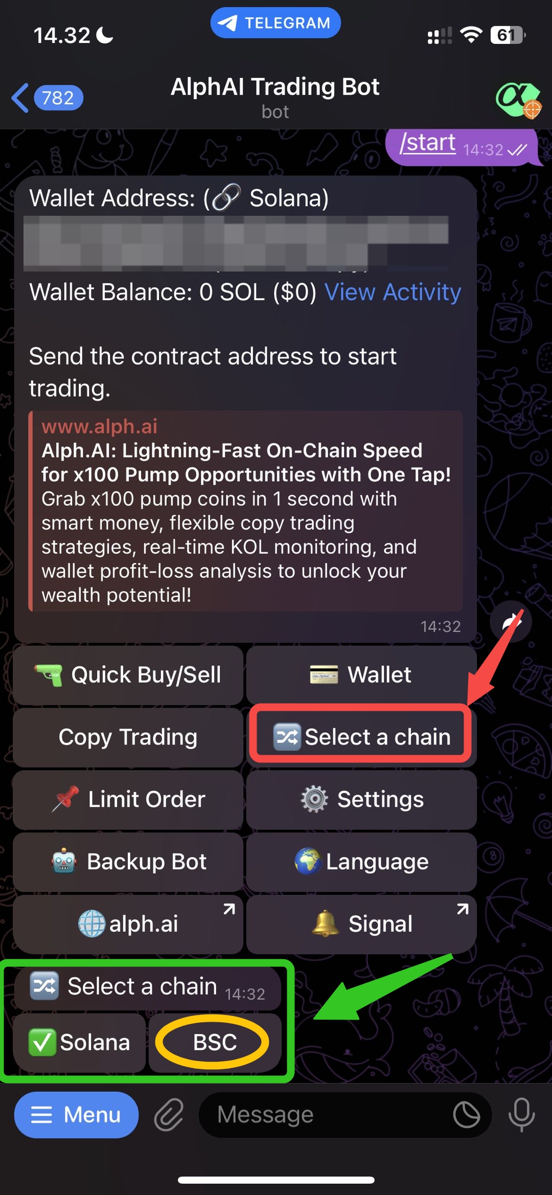Jika Anda ingin membuat BSC Address, Anda perlu mengklik select a chain dan kemudian tombol tersebut akan menyertakan pilih SOL atau BSC, Anda dapat langsung mengklik tombol BSC.